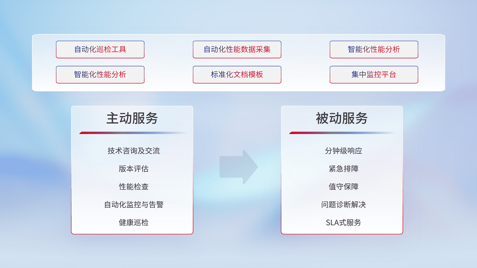 智能化工具和标准化文档,,,保障服务质量,,,提供主动服务(包含技术咨询、、版本评估、、、性能检查、、、、自动化监控与告警、、、健康巡检)和被动服务包含(分钟级响应、、紧急排障、、、值守保障、、问题诊断解决、、SLA服务)。。。。